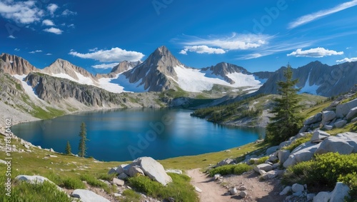 Scenic Mountain Lake Surrounded By Snow-Capped Peaks Under A Clear Blue Sky With Hiking Trail In Summer Landscape