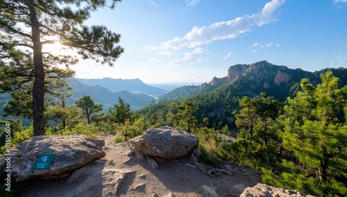 Scenic mountain view with trees and rocky foreground.
