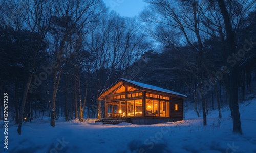 Scenic nighttime view of a cozy cabin illuminated by warm light, surrounded by a snowy forest landscape.
