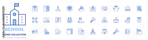 School icons collection. Line Duotone style, editable stroke. pencil case, graduate, school supplies, stapler, stationery, uniform, backpack, board, compass