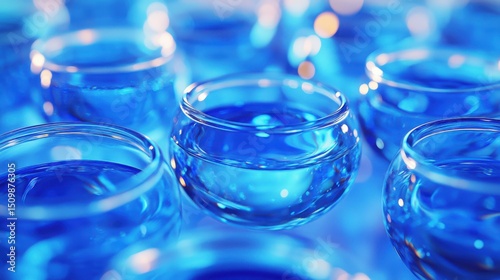 Scientific experiment showcases luminous blue liquids in glass vials arranged on a circular tray during laboratory research