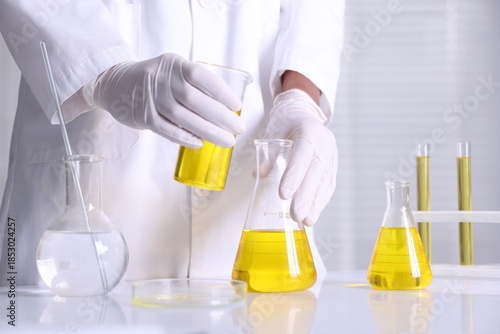 Scientist checking motor oil quality at table in laboratory, closeup