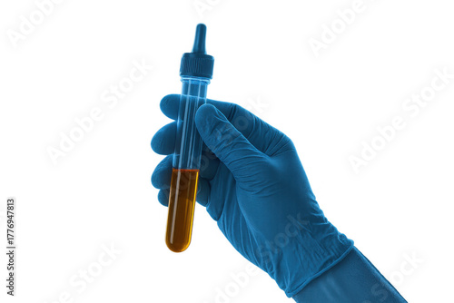 Scientist hand in blue glove holding test tube with orange liquid, researching chemical in laboratory, transparent background