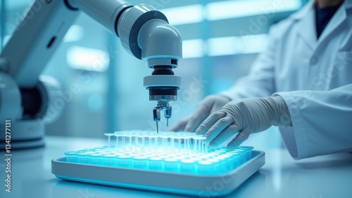 Scientist using a robotic arm to extract DNA samples from glass flasks in a sterile laboratory