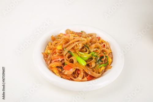 Scrambled Eggs with Sweet Potato Vermicelli Noodles and Vegetables Stir-Fry on White Plate
