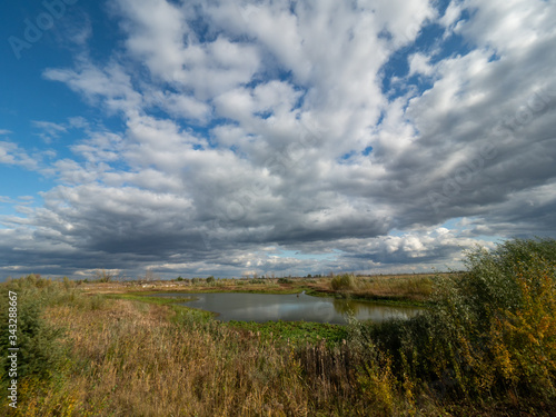 Scrap and left overs of fishing farm in Chernobyl Exclusion Zone, Ukraine. Dramatic sky over the lake.