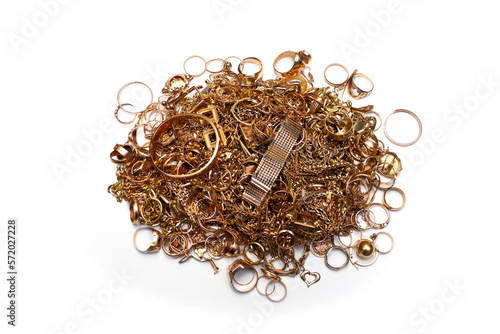 Scrap gold jewelry. Pile of old used gold jewelry on white background.