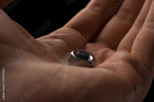 screw-nut in hands on a black background