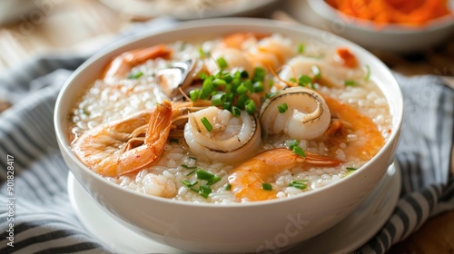 Seafood Congee Boiled Rice Soup with Sliced Fish Squid and Shrimp in a White Bowl Asian Breakfast Style