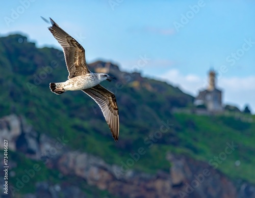 Seagull in flight over coastal hills