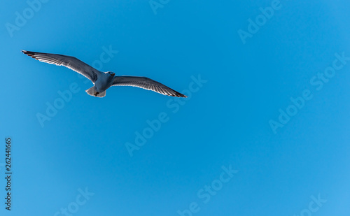 Seagull with Wings Spread Flying in a Clear Blue Sky