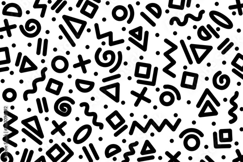 Seamless black geometric pattern with circle, line, triangle, squares, confetti, dots, stripes, polka, wave, zigzag on transparent background. Hipster memphis style or 80s & 90s retro.