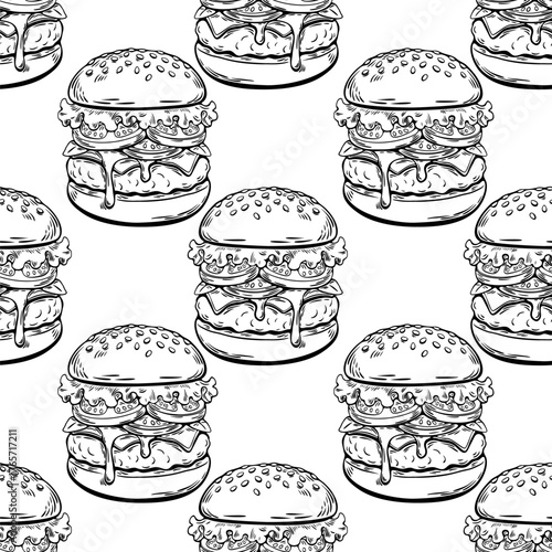 Seamless burger pattern in hand-drawn engraving sketch style