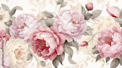 Seamless floral pattern with peonies and pearls on light background. Template design for textiles, interior, clothes, wallpaper, invitation., generative ai