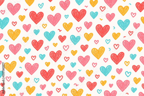 Seamless hand drawn colorful hearts pattern. Cute doodle love background. Valentine romantic sketch hearts. Red pink orange turquoise. Textile wallpaper design