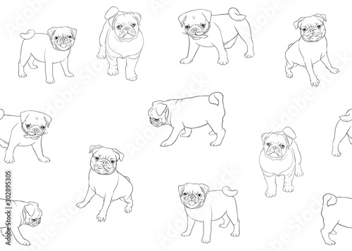 Seamless pattern, background with pug dogs. Colored vector illustration. Isolated on white background.