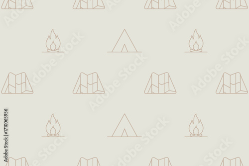 Seamless pattern featuring camping elements like tents, campfires, and mountain outlines on a light background