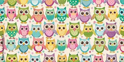 Seamless pattern featuring cute owls in various poses and colors, owls, animals, bird, wildlife, nature, seamless
