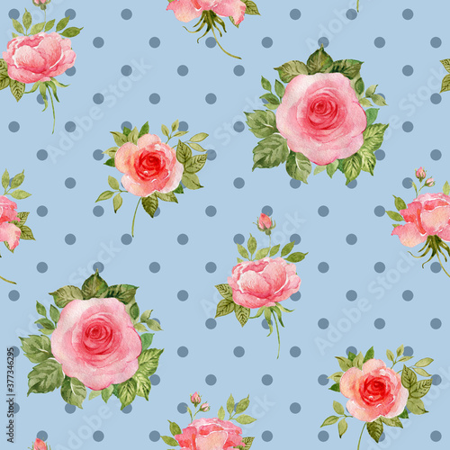 Seamless pattern of beautiful roses drawn by paints with buds and foliage