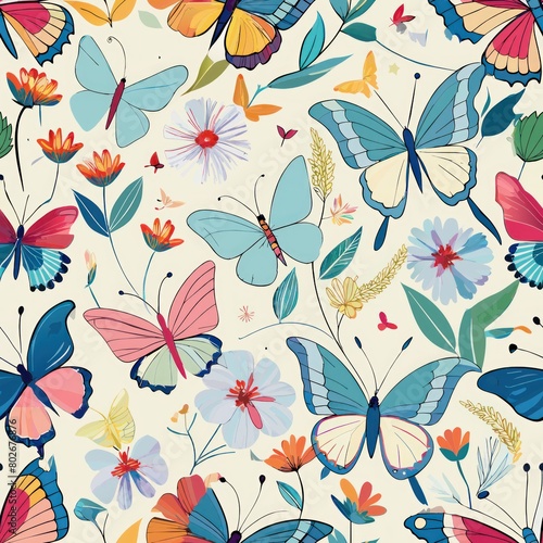 Seamless pattern of delicate butterflies fluttering among spring flowers, Generative AI