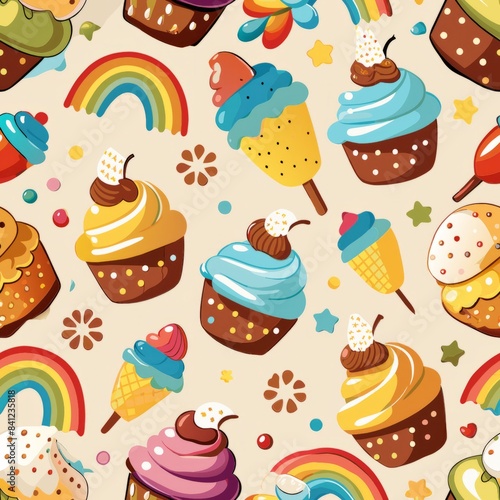 Seamless pattern of dessert toppings like whipped cream, chocolate sauce, and rainbow sprinkles, adding a finishing touch to any design, Generative AI