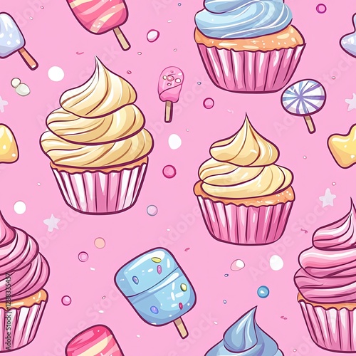 Seamless pattern of pink background with various cupcakes and candy for dessert themes