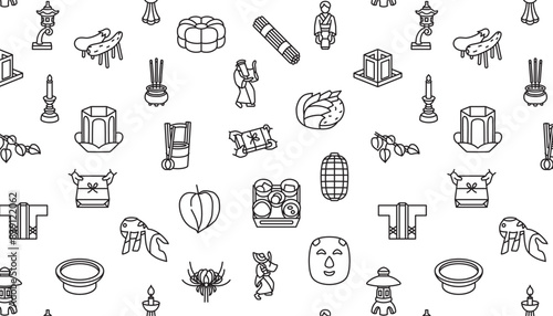 Seamless pattern of traditional Japanese summer festivals in black line style