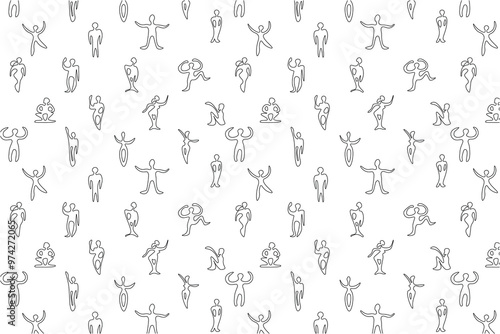 Seamless pattern. Stylized human figures. Black outline on white background. Flyer background design, advertising background, fabric, clothes, texture, textile pattern.