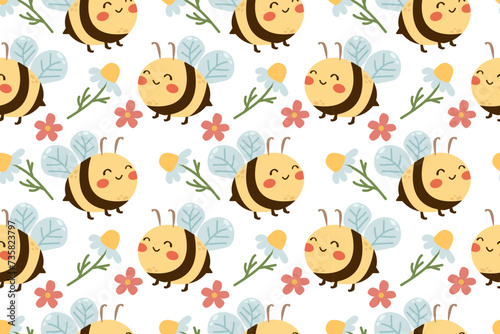 Seamless pattern with bee cartoons and little flowers on white background vector illustration. Cute cartoon character , flat doodle insect pattern for your design paper or fabric print.
