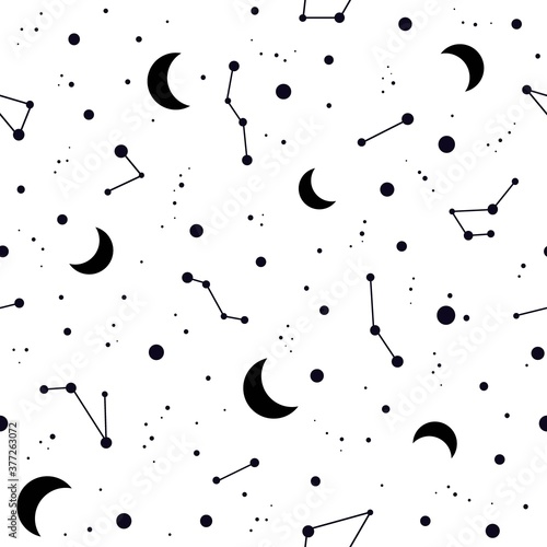 Seamless pattern with black constellations, stars and moon crescent on white background.