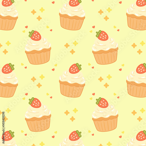 Seamless pattern with cute strawberry cupcakes and cream topping in flat cartoon style. Fun dessert repeat on pastel yellow background.