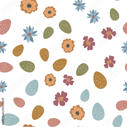 Seamless pattern with Easter eggs and flowers. Flowers, eggs, easter, spring. Textile, print, spring festival.