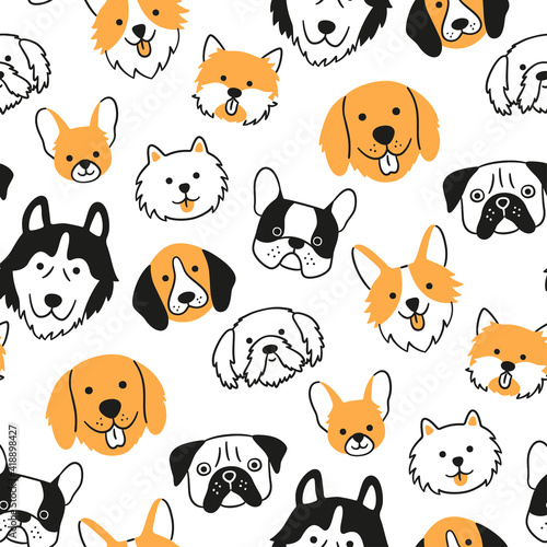 Seamless pattern with heads of different breeds dogs. Corgi, Pug, Chihuahua, Terrier, Husky, Pomeranian. Texture with dog faces. Hand drawn vector illustration in doodle style on white background