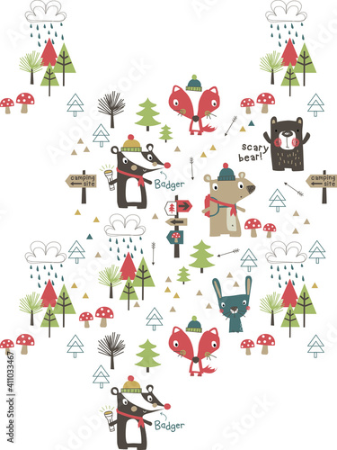 Seamless pattern with nature and camping themes for babies. Scandinavian style baby bedding set, throw pillow, baby clothes, wallpaper, background, you can use it in your gift wrapping designs.