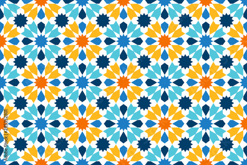 Seamless pattern with portuguese tiles. Vector illustration of Azulejo on white background. Mediterranean style. Multicolor design.