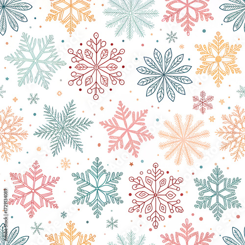 Seamless repeating pattern of colorful snowflakes in pastel palette, playful and modern, no text