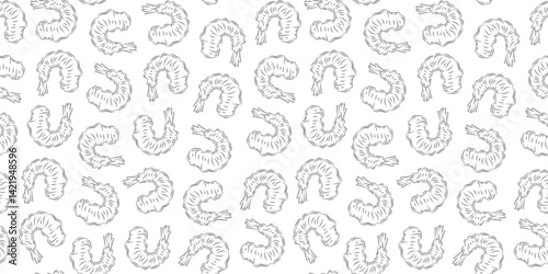 Seamless Tempura Shrimp Doodle Pattern background. Seafood Pattern Design. Fried Shrimp Seamless pattern Background. Crunchy Tempura Doodle Pattern.