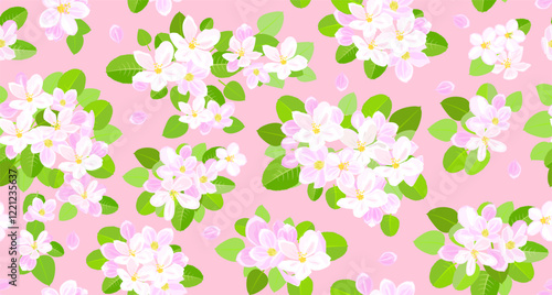 seamless texture with white flowers and leaves. apple blossoms and petals against pink background