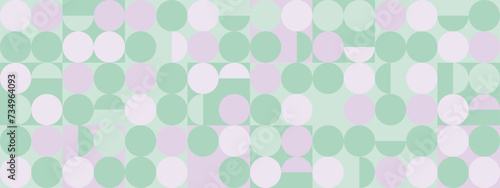 Seamless trendy green and lavender background with circles and squares for textiles or covers. Mosaic with purple and pistachio geometric shapes texture, template for web intro.