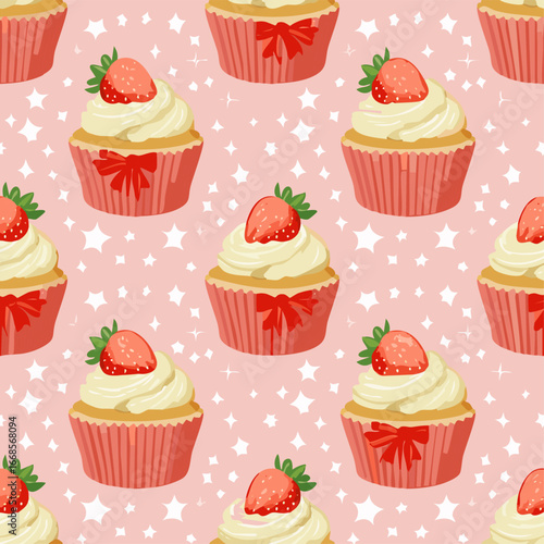 Seamless vector pattern with cute bento strawberry cake and red bows. Girly dessert on pink background. Hand drawn doodle coquette texture for wallpaper, wrapping paper, textile design