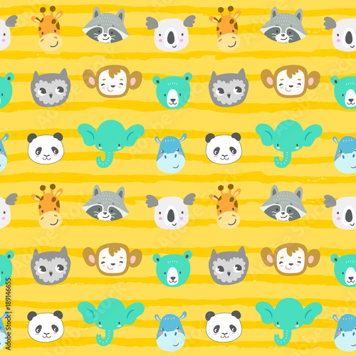 Seamless vector pattern with cute smiling animal heads. Cartoon elephant, monkey, raccoon, panda, owl, giraffe, bear, koala and hippo. Funny zoo characters.