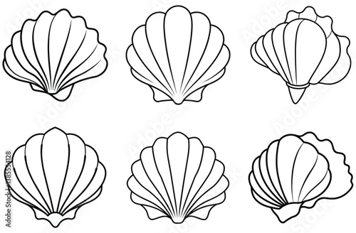 Seashell Outline Set, Black and White, Various Angles, Elegant Aquatic Creatures Design