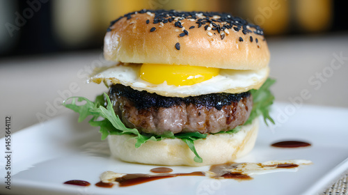 Seasonal Japanese Burger with Beef Patty, Fresh Greens, Egg, and Unique Sauce Presentation on White Plate