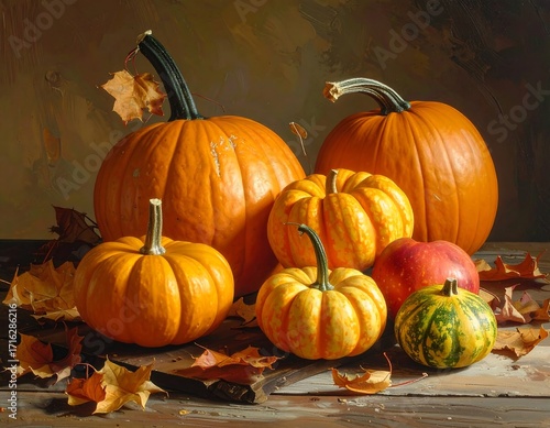 Seasonal pumpkins arranged with dried leaves on a wooden floor