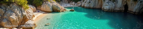 Secluded cove bathed in summer sunlight, turquoise water laps gently against smooth rocks Perfect for relaxation and escape Ideal for travel, vacation, and nature themes , escape, sea, wild
