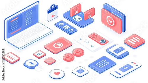Secure digital interface elements on laptop, phones, and tablets; data privacy, cybersecurity concept; white background; for website design