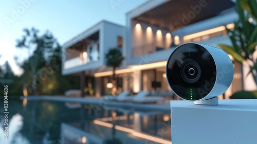 Security camera mounted on a wall overlooking a pool and modern house.