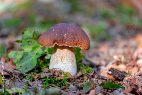 Selective focus of wild bolete mushroom in the wood, Boletus edulis is a basidiomycete fungus and the type species of the genus Boletus, Penny bun fungus in the forest, Natural Autumn background.