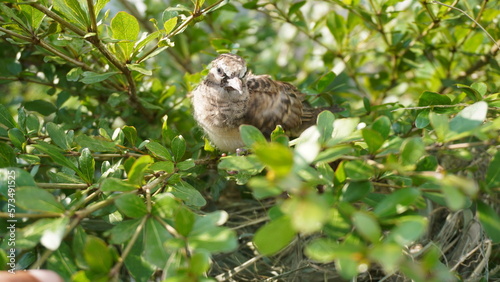 Selective focus turtledove baby young bird on a tree branch with their nest