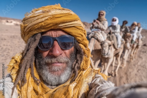 Selfie of a bearded traveler in a yellow scarf with a camel caravan in the desert